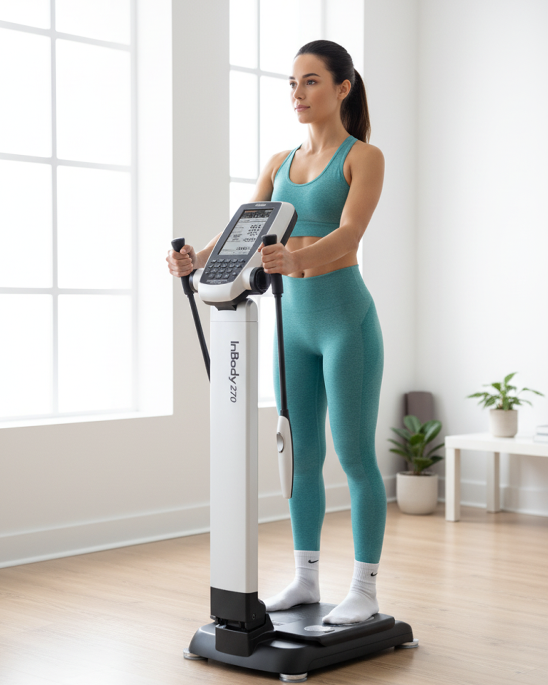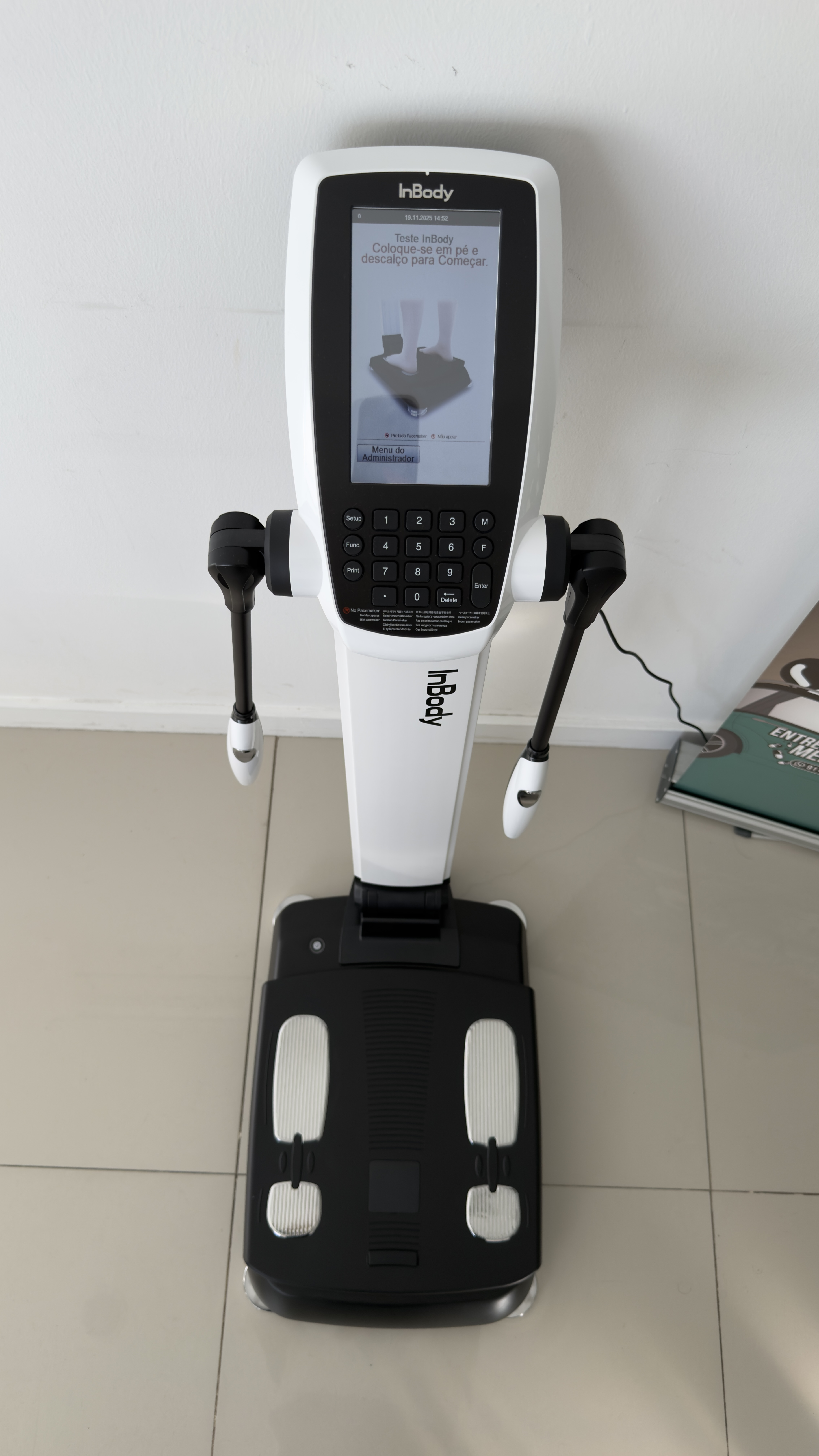 A InBody é um equipamento de referência mundial que utiliza tecnologia avançada para realizar uma análise completa da composição corporal, fornecendo dados reais e fiáveis, sem estimativas.